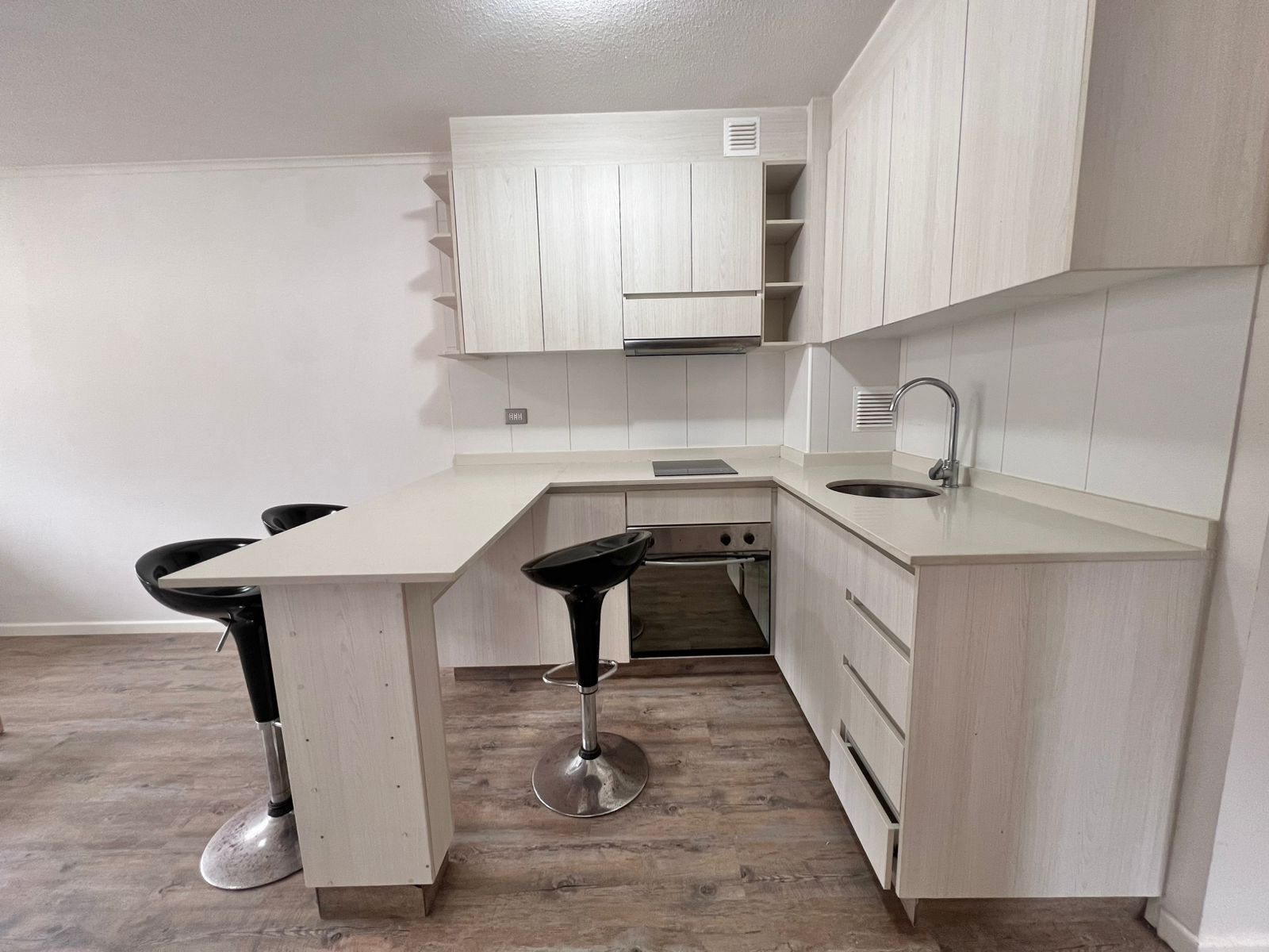 Cocina amoblada y equipada con encimera, horno eléctrico y campana extractora