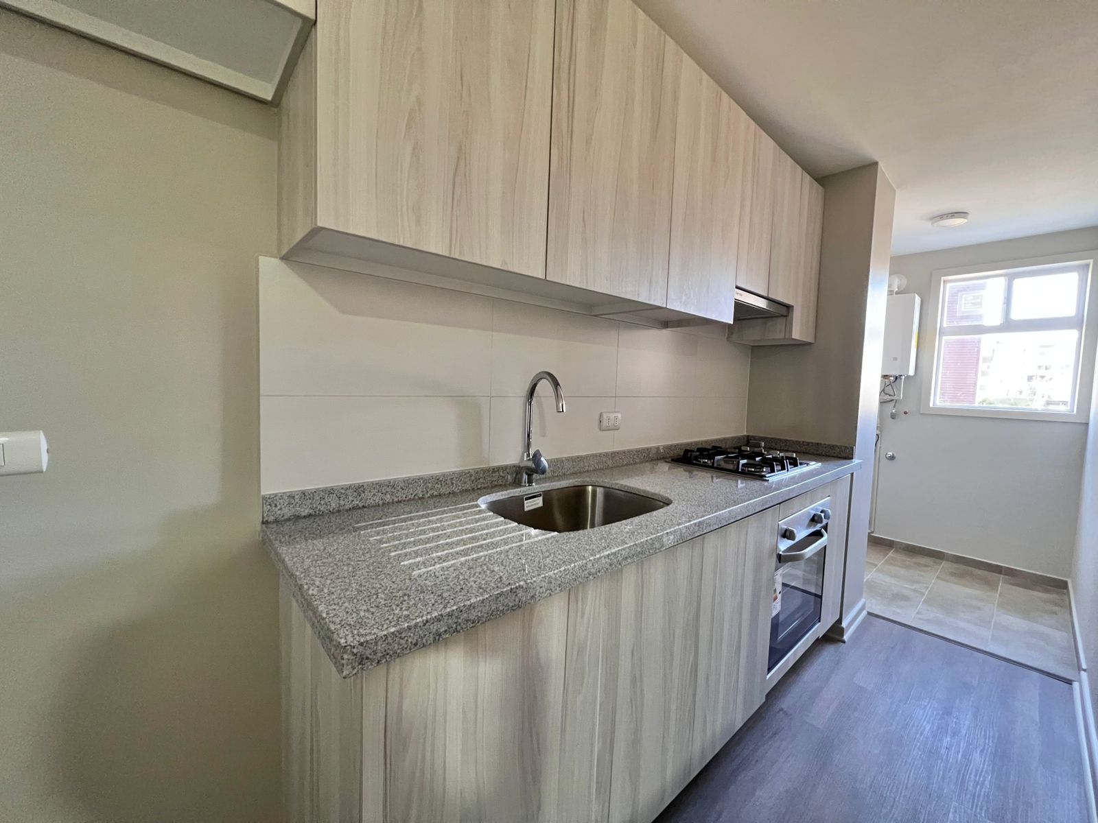 🔹 Cocina de concepto abierto con encimera a gas, horno eléctrico, campana extractora y prácticos espacios como desayunador y logia con conexión a lavadora.